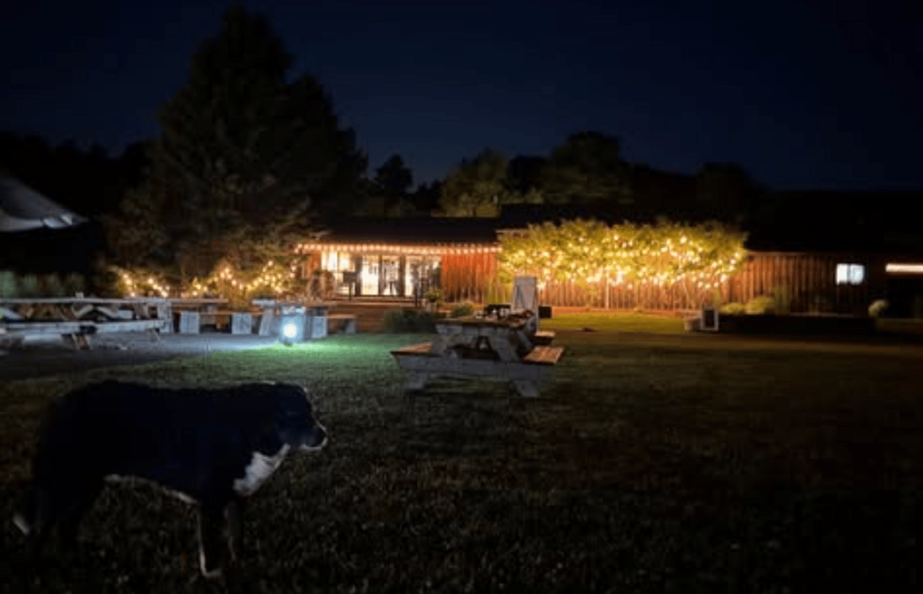 🪑 Meadow patio with picnic tables, wood-fired pizza, and orchard charm.