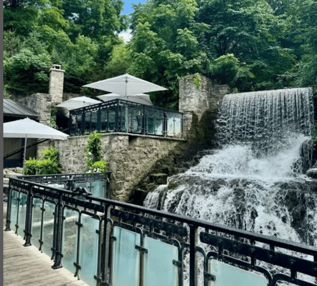 🪑 Patio beside a waterfall in a historic mill setting.